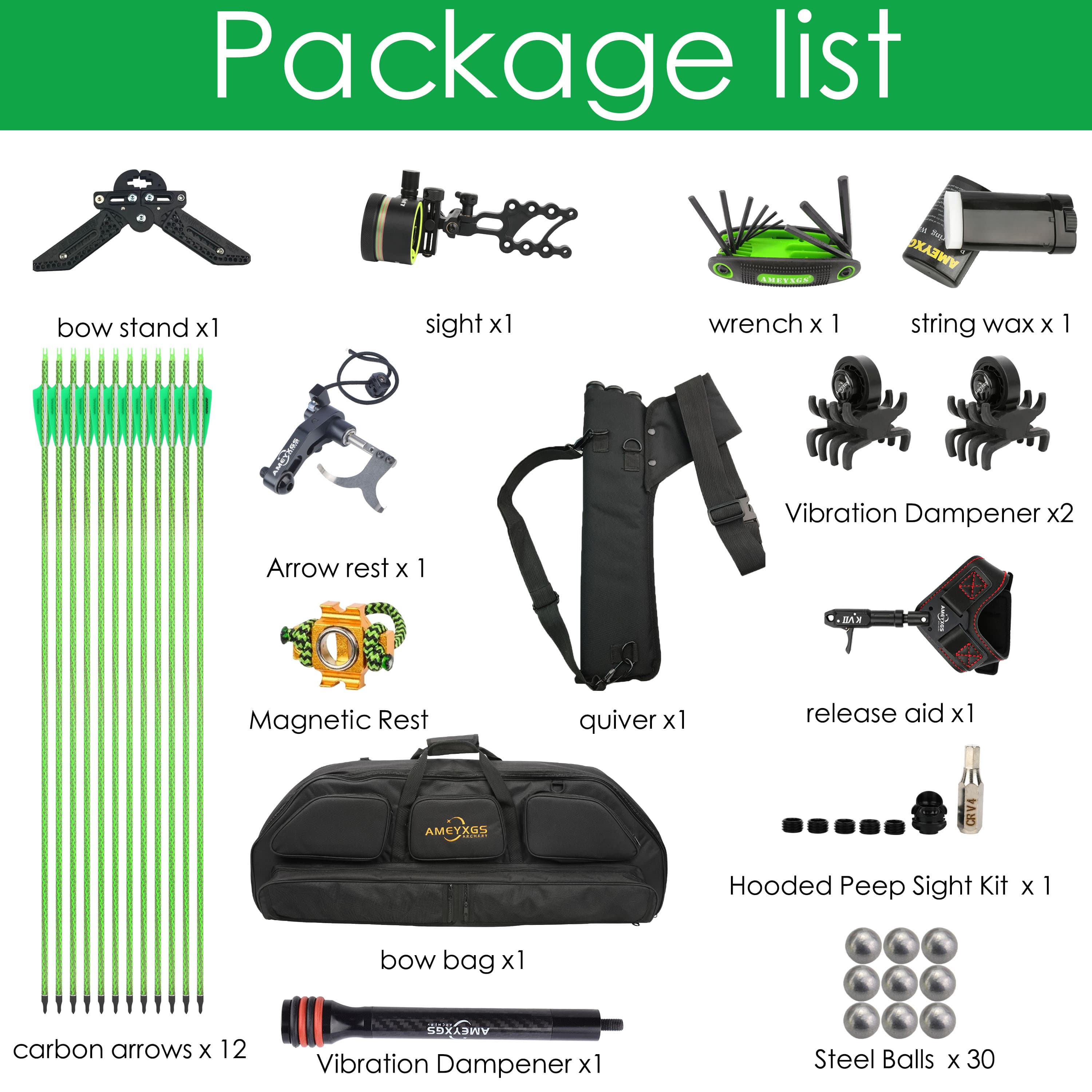 1. Type 1 wheel system, with a minimum IBO arrow speed of 360fps, 22mm wide-body pre-curved limbs, offering long lifespan and minimal poundage loss.