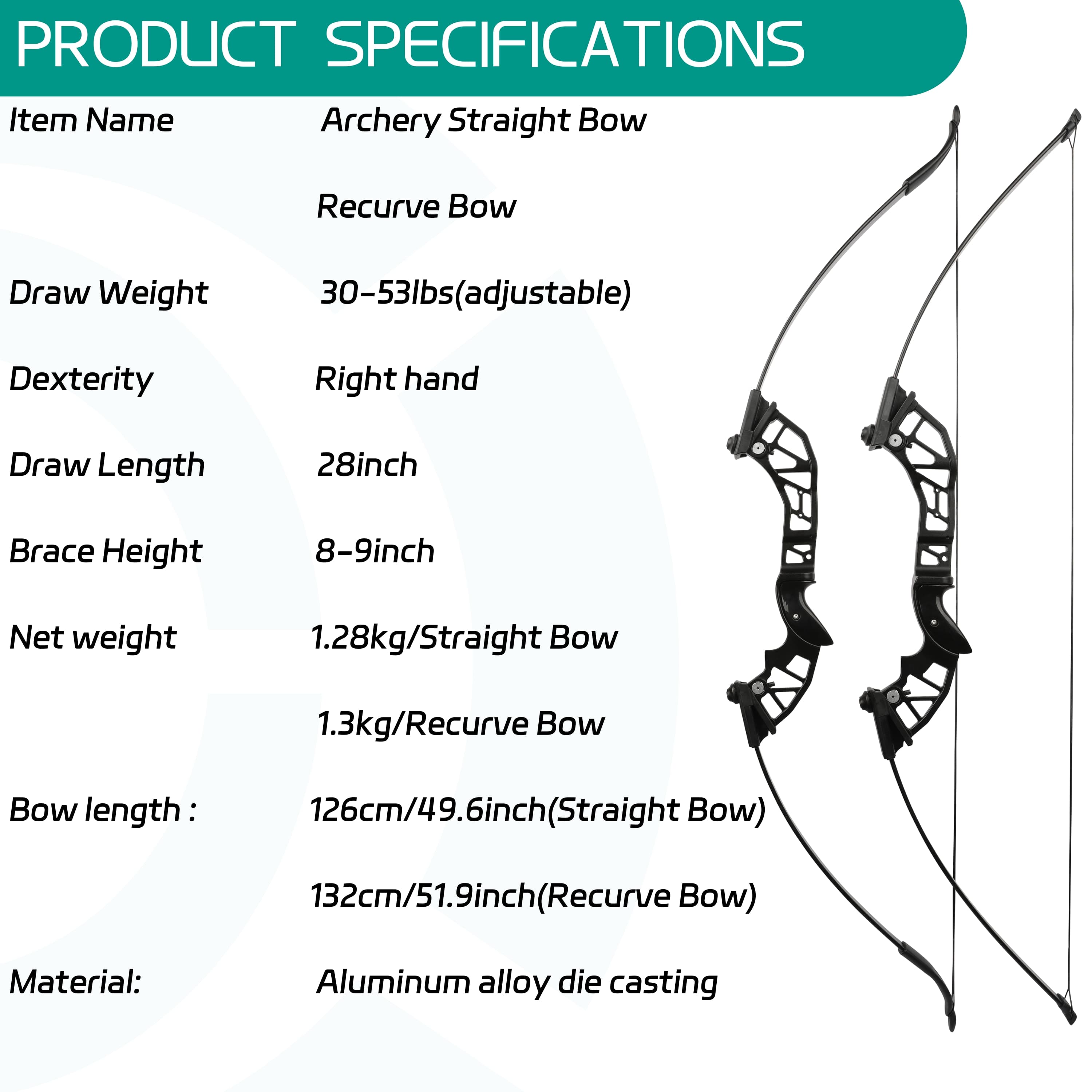 • Net weight: 1.28kg/Straight Bow, 1.3kg/Recurve Bow